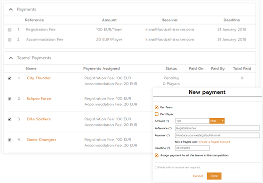 Assign payments to selected teams, set deadlines, track who and when paid. Stop chasing down fees and matching them with your bank statement. Receive money quickly & securely.