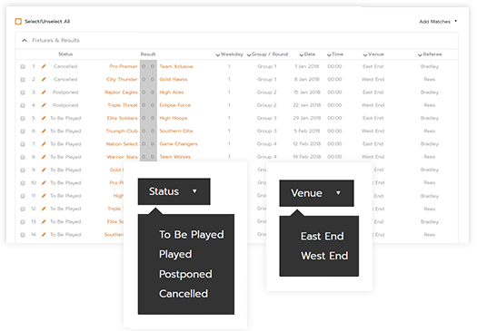 Esqueça o caos produzido por atrasos, cancelamentos, clima ou mudanças dos campos. Confronte as alterações de última hora com a Competize e administre os seus horários, campos e estados das suas partidas numa única visualização.